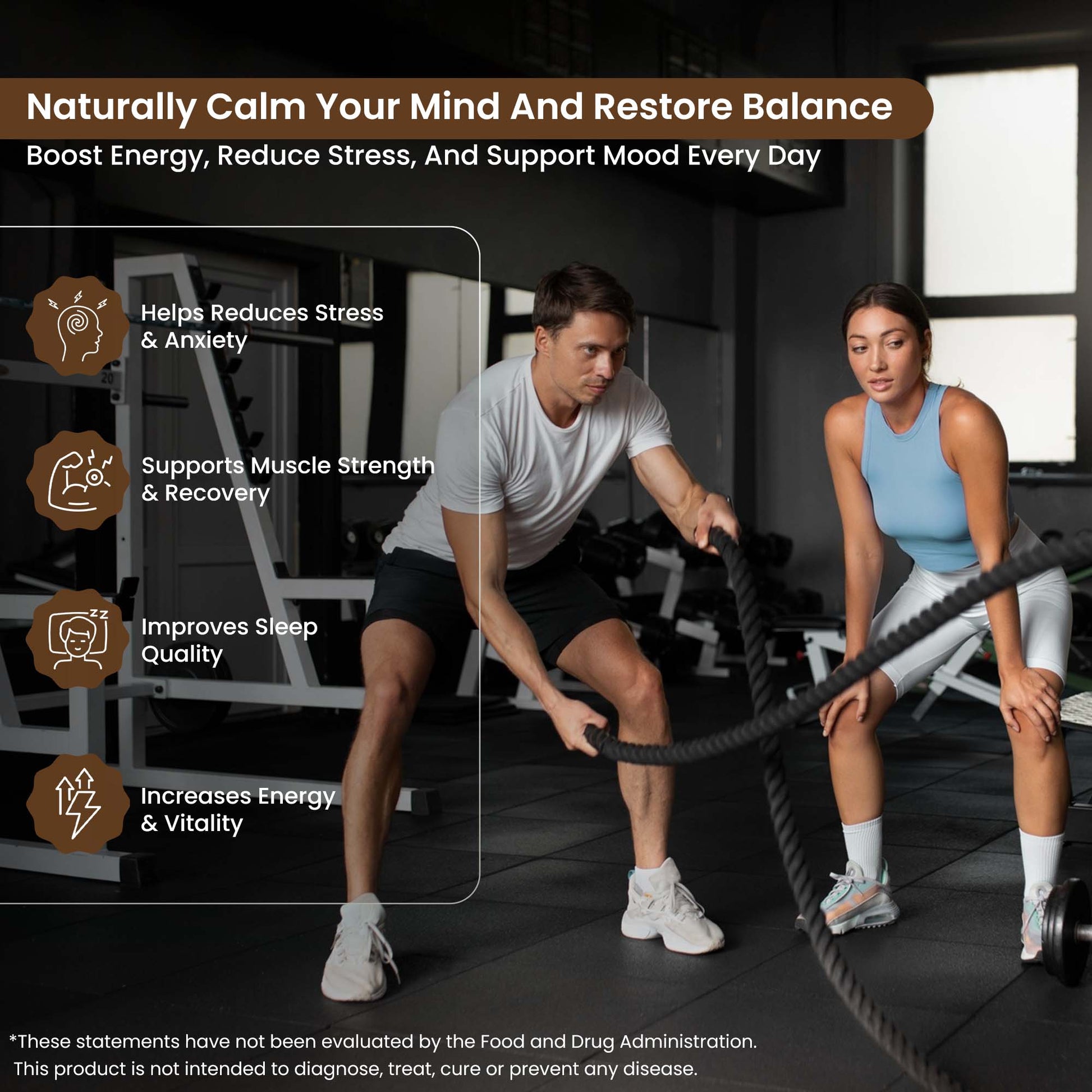 In a controlled wellness assessment, adults taking ashwagandha extract daily reported improvements in calmness, focus, and overall stress resilience after 6–8 weeks.