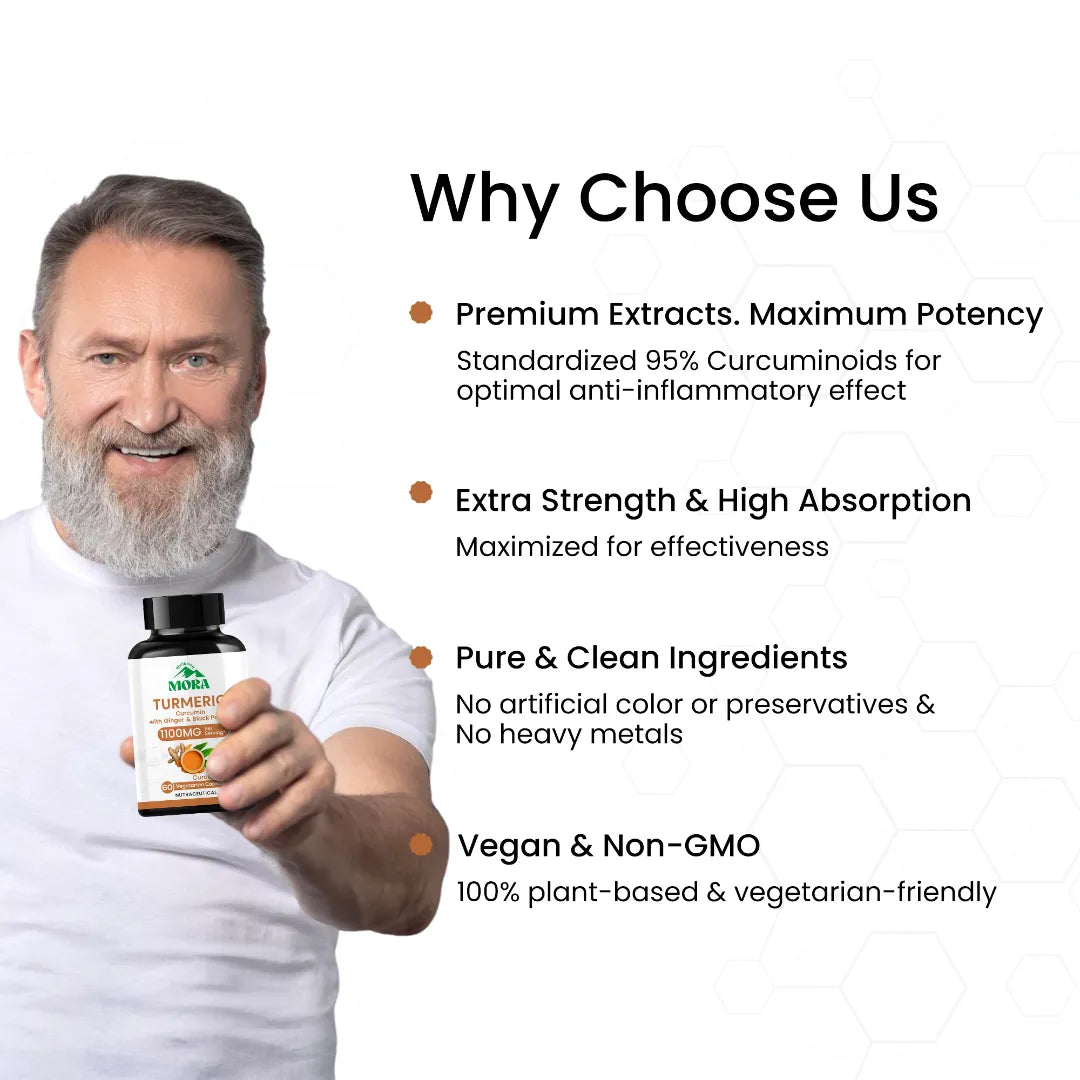 Bring warmth, balance, and natural resilience back into your day with MORA Turmeric Complex Capsules - a powerful blend of pure Turmeric, high-strength Curcumin extract, Ginger, and Black Pepper for enhanced absorption. Designed to support daily wellness, mobility, and antioxidant protection, this herbal formula helps you feel active, lighter, and naturally aligned.