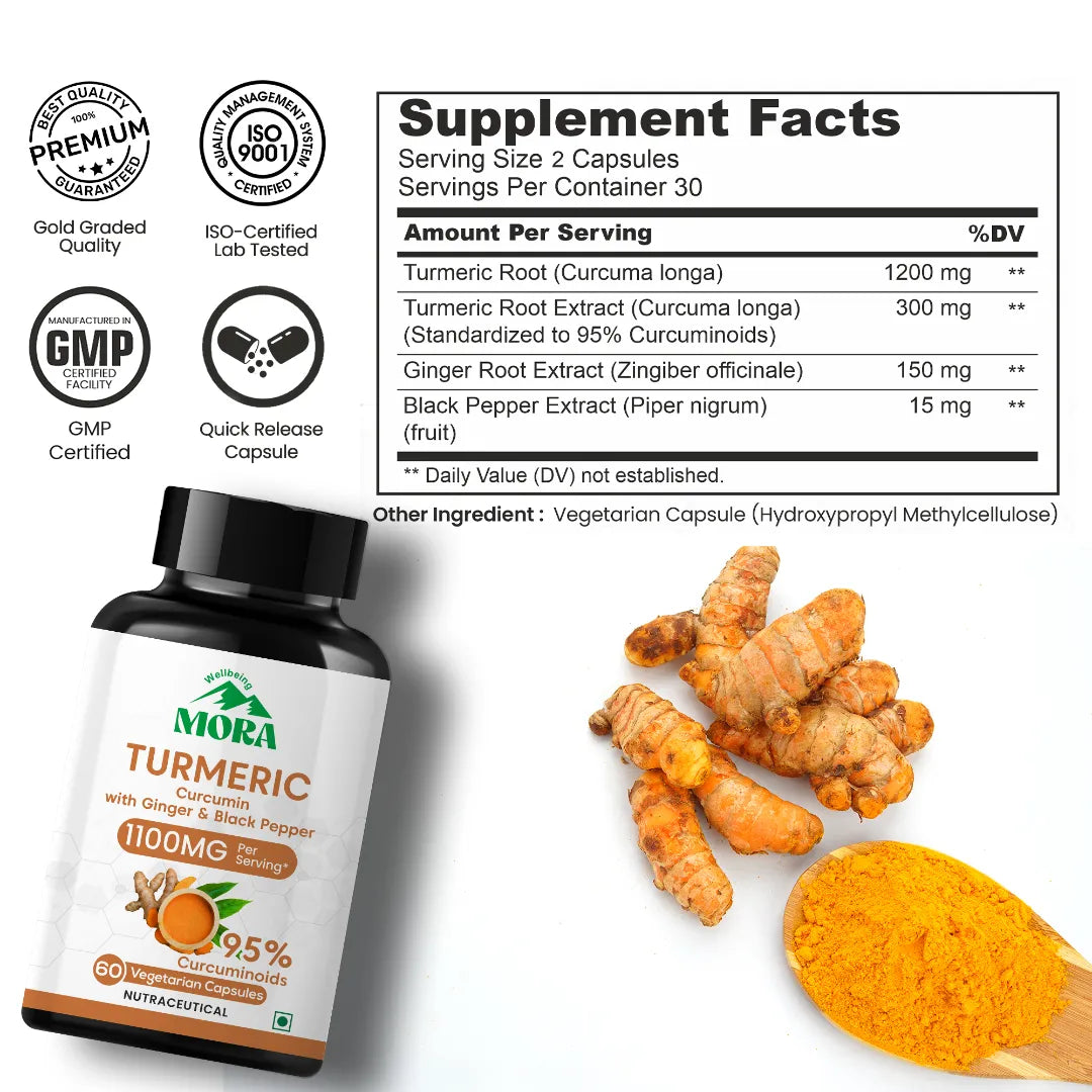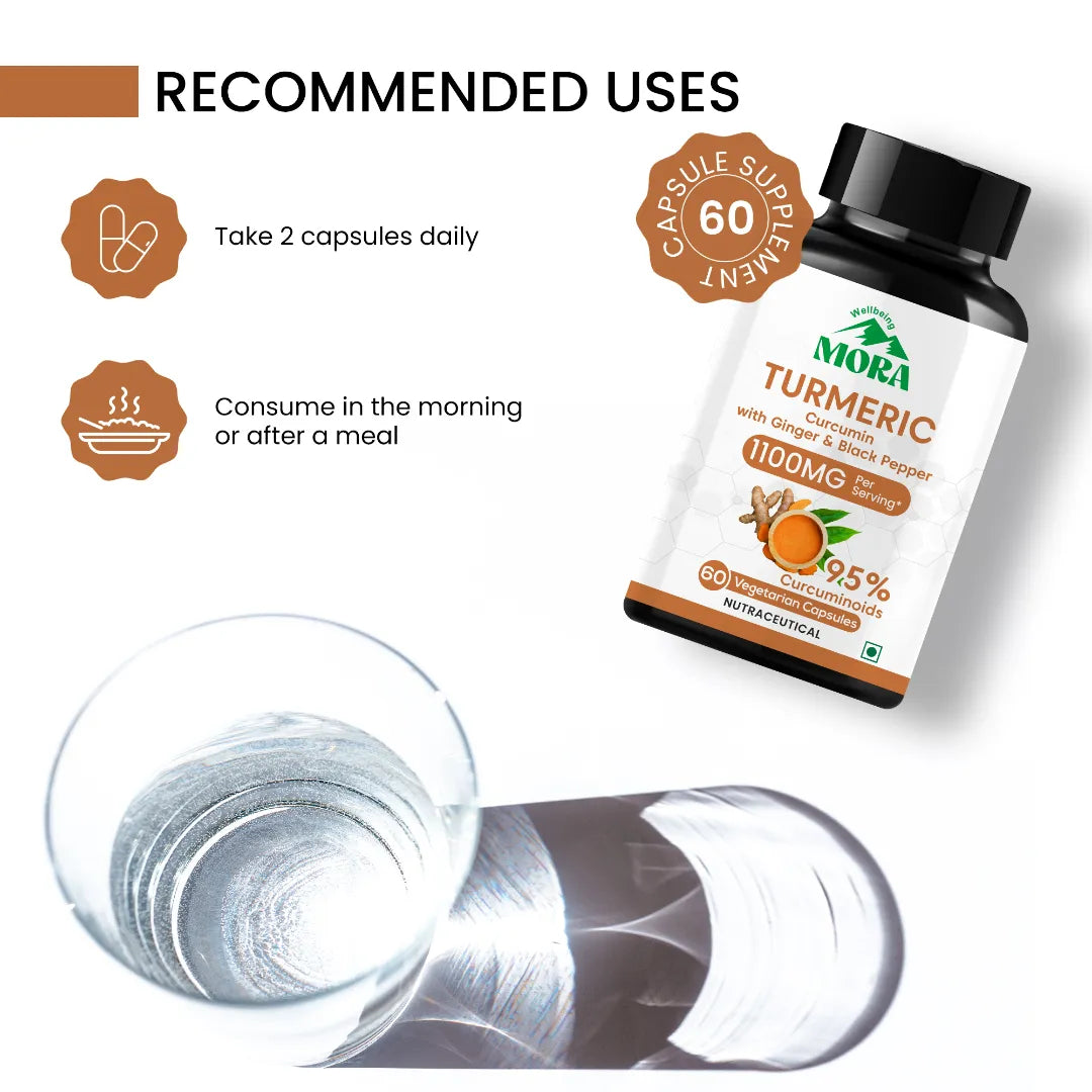 For centuries, Turmeric has been celebrated in Ayurveda for promoting inner balance and supporting overall vitality. At Well-Being MORA, we combine 1200 mg of Turmeric Root, 300 mg of 95% Curcuminoid Extract, and synergistic herbs like Ginger and Black Pepper to create a clean, concentrated supplement your body can use every day. Each capsule delivers nature’s golden goodness in its most absorbable form - helping you stay flexible, energized, and centred through daily routines. Perfect for anyone seeking a natural way to support movement, immunity, and daily wellness, this is more than just a Turmeric supplement - it’s your everyday dose of Ayurvedic nourishment and long-term vitality.